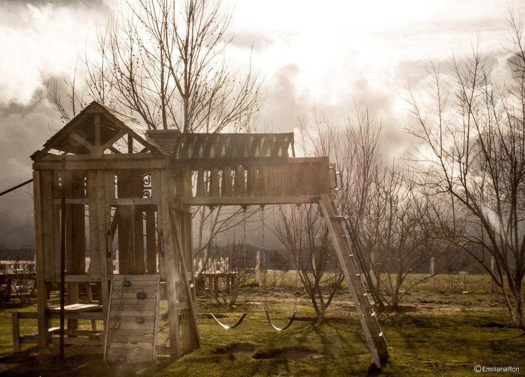 También recordé a una vecina de la infancia, abuela de mi amiga del barrio que siempre nos amenazaba con que vendría el viejo de la bolsa sino regresábamos a tiempo a la casa…. (personificado en el único indigente que se veía por mi pueblo: el Loco molina). Decir que crecí y comprendí que el loco molina no mataba ni una mosca…. Pero había algo más en esta imagen…. Sí: mi mamá, yo y mi infancia… lo recordé perfectamente, una vez mi mamá me olvido en el parque, yo vi cuando se iba mientras yo me hamacaba…, pobre de mi, pobre de mi mamá… y no me olvido mi papá que también estaba… me olvido mi mamá, que no tardó mas de cinco minutos en regresar pero para mí fueron horas de seguir hamacándome, aguantándome la angustia sin llorar… Ahora sí comprendo esta imagen, tal vez sea el miedo de volver a perdernos…
